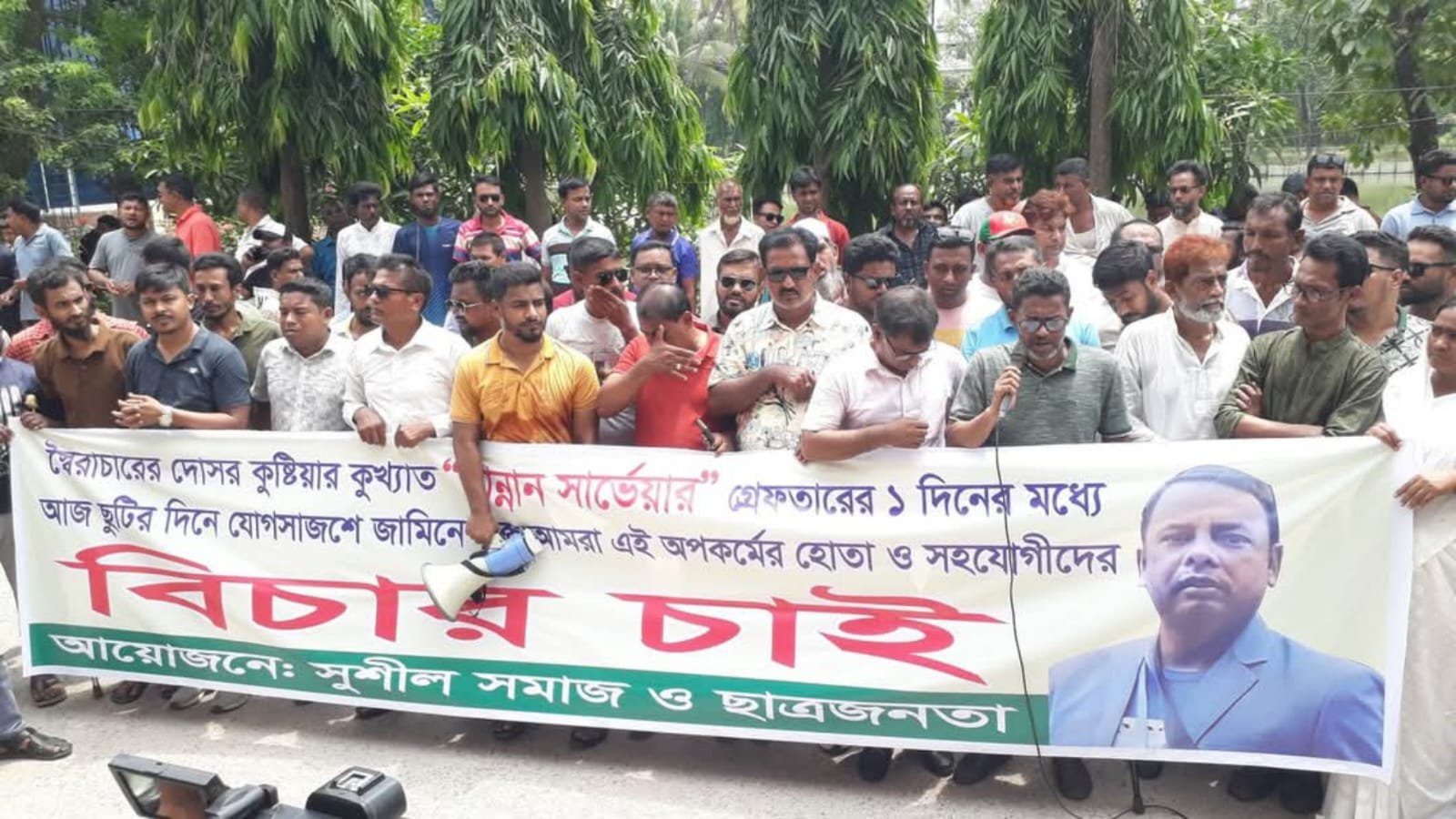 কুষ্টিয়ায় জুলাই-আগষ্ট আন্দোলনে ছাত্র জনতার উপর হামলার এজাহারভুক্ত আসামিকে গ্রেফতারের ২৪ ঘন্টায় আদালত থেকে জামিন দেওয়ার প্রতিবাদে মানববন্ধন ও বিক্ষোভ সমাবেশ অনুষ্ঠিত হয়েছে। সুশীল সমাজ ও ছাত্র জনতার ব্যানারে অনুষ্ঠিত মানববন্ধন ও বিক্ষোভ সমাবেশে বিএনপি ও অঙ্গসহযোগী সংগঠন, জাতীয় নাগরিক