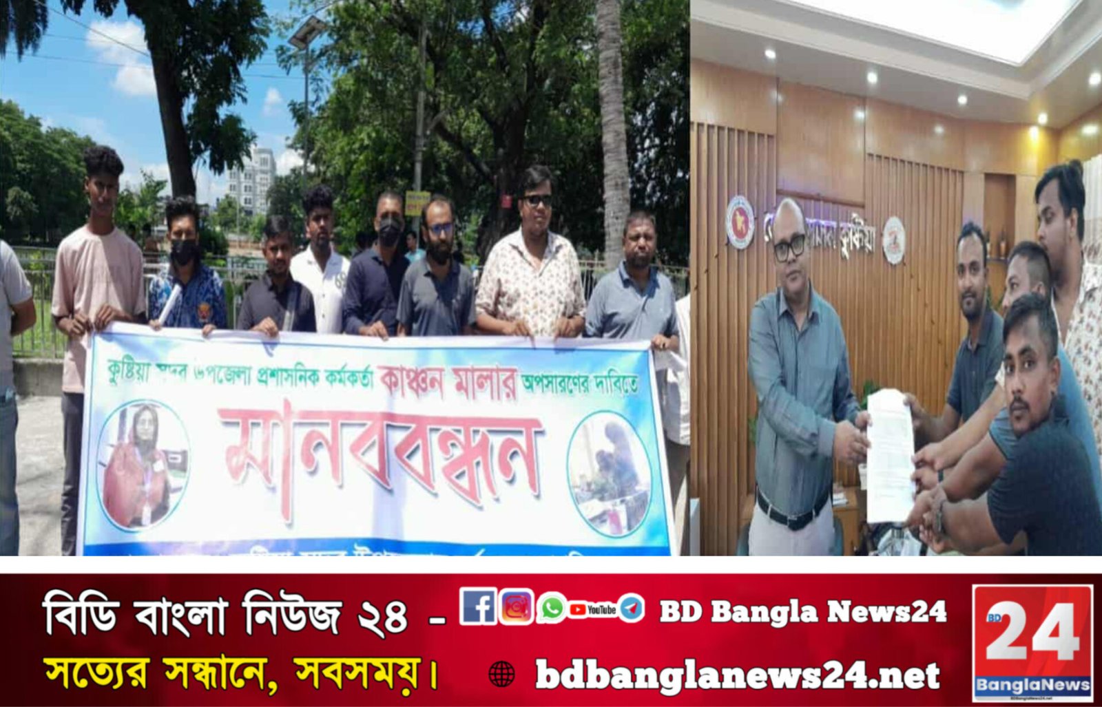 কুষ্টিয়া সদর উপজেলার প্রশাসনিক কর্মকর্তা মিসেস কাঞ্চন মালার বিরুদ্ধে অশোভন আচরণ, দুর্নীতি ও ক্ষমতার অপব্যবহারের অভিযোগ এনে জেলা প্রশাসকের কাছে স্মারকলিপি প্রদান ও মানববন্ধন করে জেলার সাধারণ নাগরিকসমাজ ও ভুক্তভোগী।